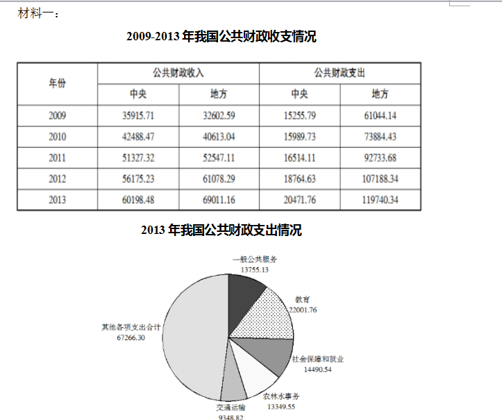 64.根据材料一,2013年中央公共财政收入为60198.48,中央公共财政支出为20471.76,因此可以判断2013年中央的财政状况为( )。